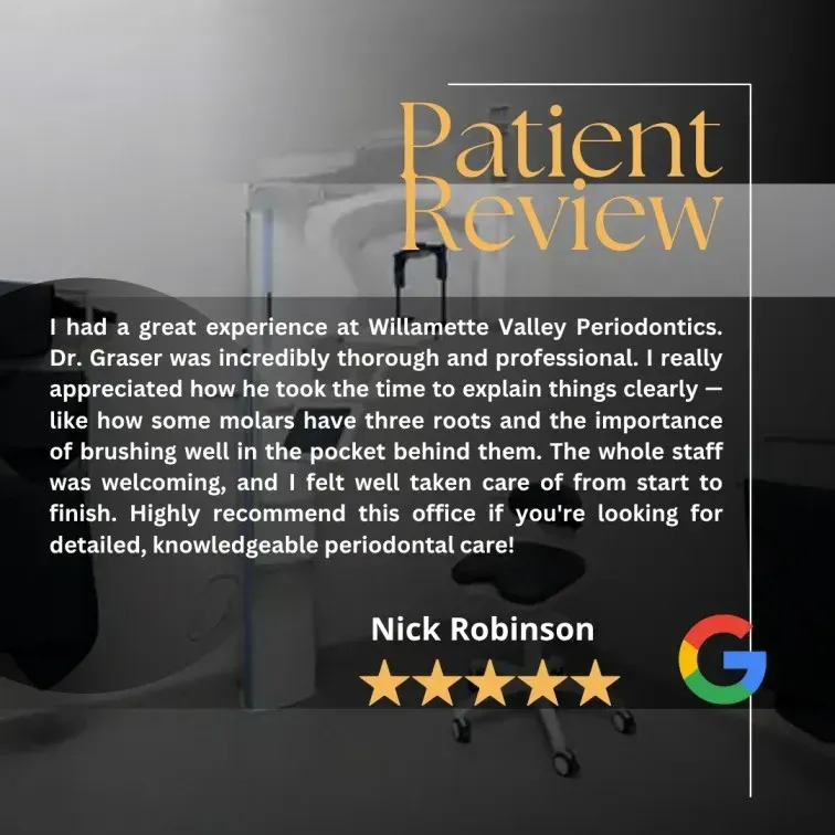 Dr. Colin Graser has been placing implants for over 10 years, trained on multiple systems over the years. He did a 3 year residency in periodontology and implant dentistry, and has placed over 1000 implants. Being a periodontist allows him the insight to control the health of both the hard AND soft tissue at implant sites. He takes on average 100 CE hours/year (5X the requirement) and is a member of multiple implant focused organizations. He utilizes technology (CBCT, guided surgery, biologics, guided bone regeneration) to ensure the best outcomes possible.